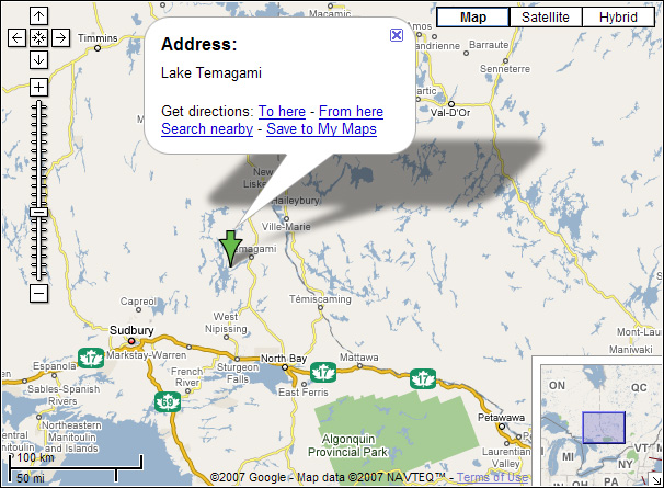The Town of Temagami is located on Highway 11 approximately 100 km (60 miles) north of North Bay or 70 km (40 miles) south of New Liskeard.